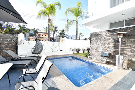 - Alberca climatizada, terraza y jardín, medio baño